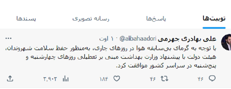 «با توجه به گرمای بیسابقه هوا در روزهای جاری، بهمنظور حفظ سلامت شهروندان، هیئت دولت با پیشنهاد وزارت بهداشت مبنی بر تعطیلی روزهای چهارشنبه و پنجشنبه در سراسر کشور موافقت کرد.»