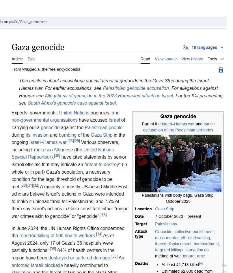 صفحه «نسل کشی غزه» در ویکی پدیا به 16 زبان بین المللی ترجمه شده است (ویکی پدیا)