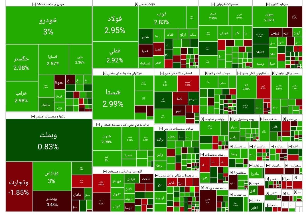 نمادهای «خودرو»، «فولاد» و «فملی» بیشترین تأثیر مثبت را بر شاخص کل گذشتند.
